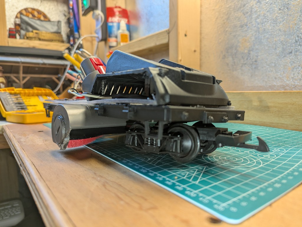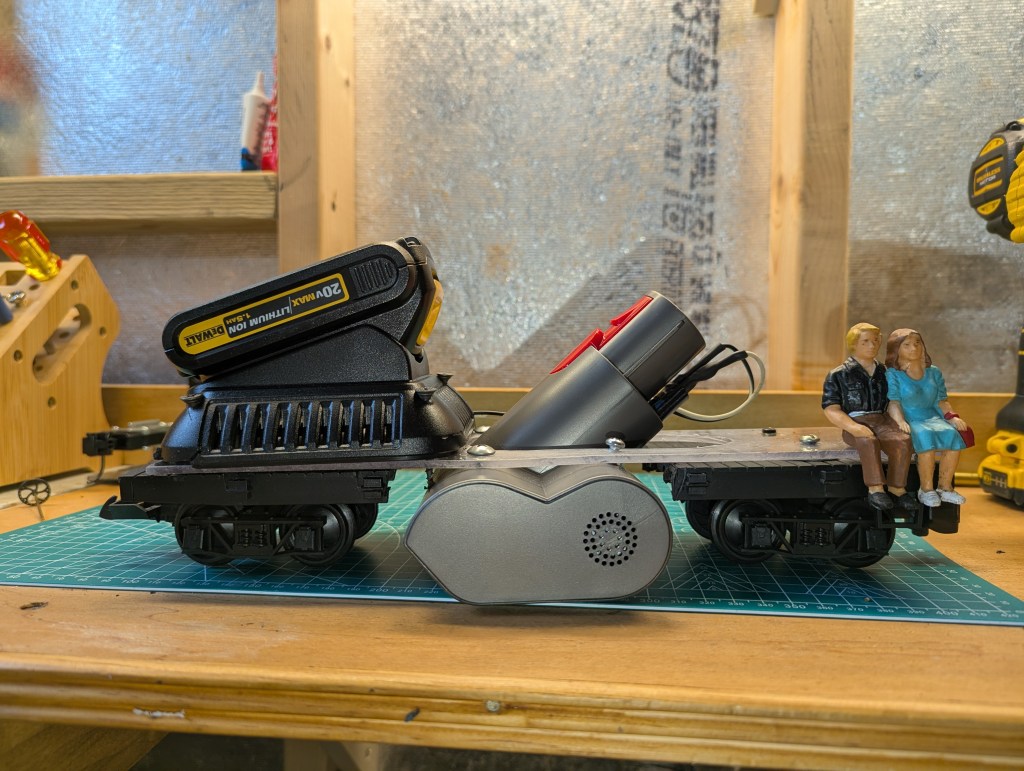 Then I cut apart a flat car and used a piece of lexan to mount the vacuum attachment to both car ends. A spare dewalt charger was used for the battery mount, so the car will run on dewalt batteries, which are common on the ESL.