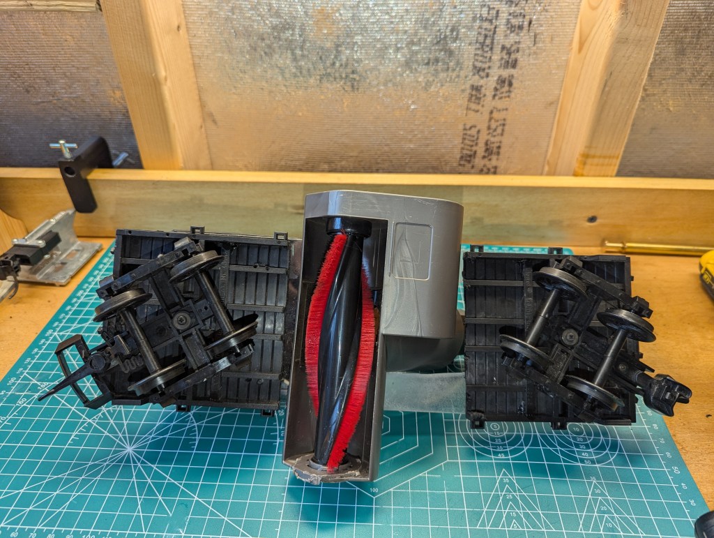 Below is the “after” shot from sweeping the line (the upper one in the photo); the car works better than anticipated! Next up: 1) mount a mini blower 2) integrate an on/off switch and potentiometer to regulate the sweep speed, and 3) paint and accessories to make this into a proper maintenance-of-way car.