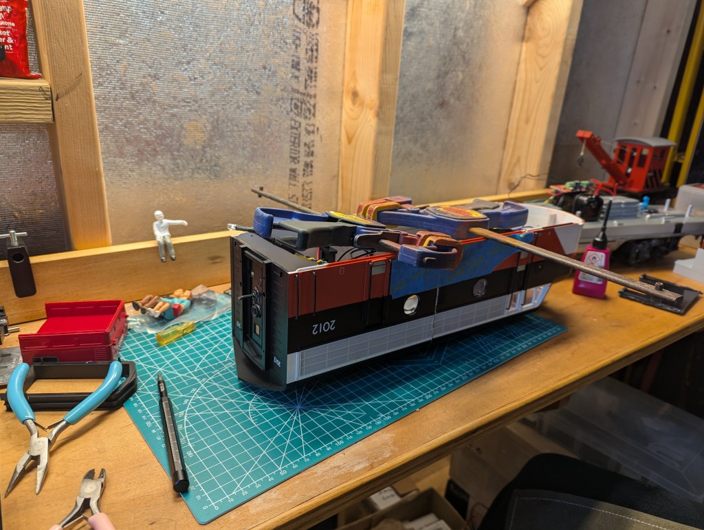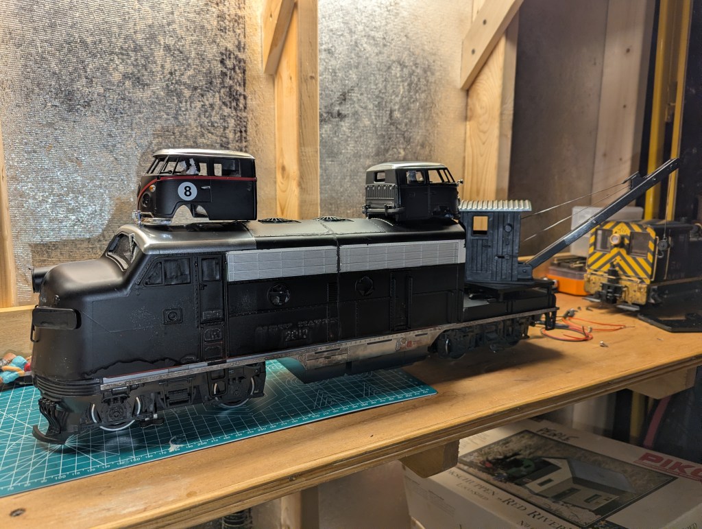 The donor crane is from a “toy train” car made by LGB. So, the middle of the F7 train shell had to have 6 inches removed. This is a big deal to this train shop; such a big undertaking had not yet been attempted. The top and sides were carefully scribed using a square and level, and then the dremel team went to work with a cutoff wheel. The cuts were decent and only left a gap of a few millimeters to fill on one side. Most of the cut line will be obscured by detailing on the model.