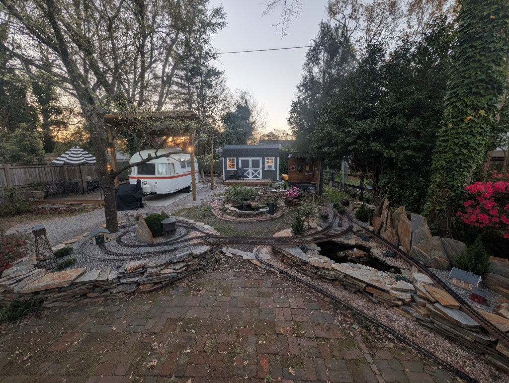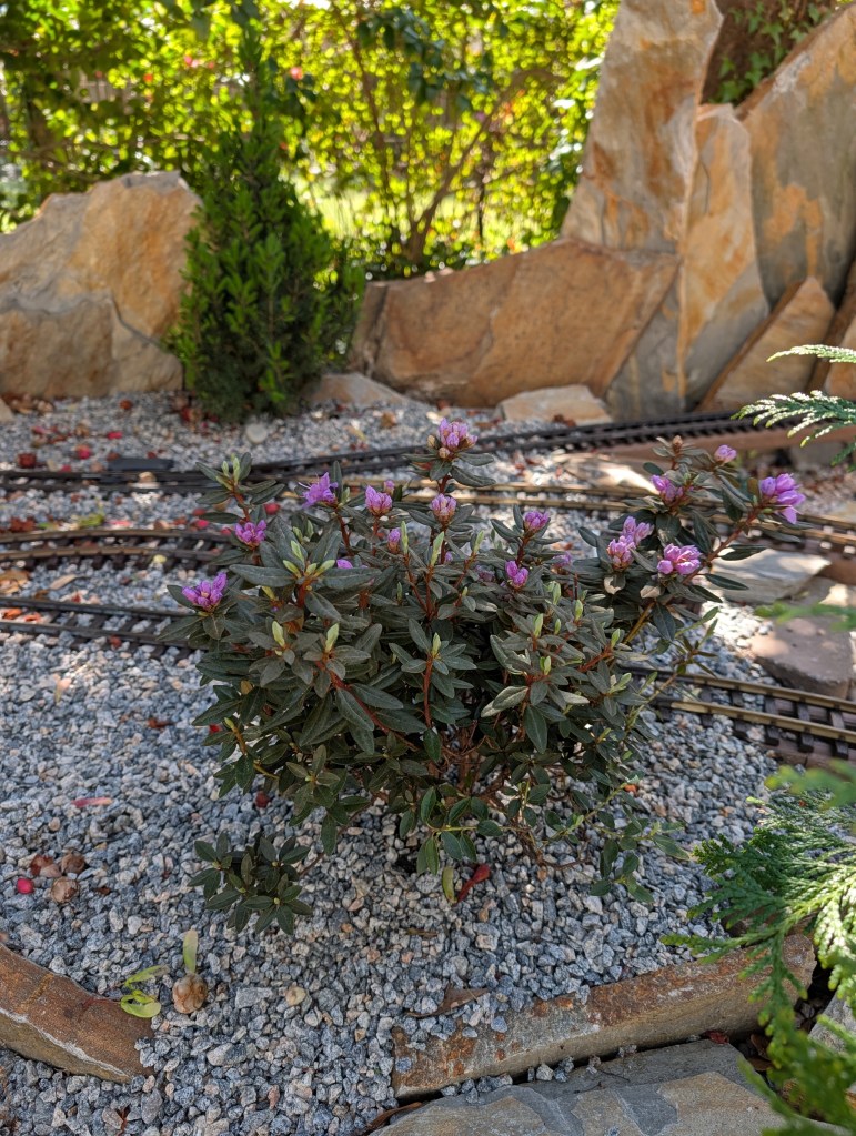 In preparation for a springtime garden celebration, WESL operating capacity has been tested at the current trackage maximum traffic load. The upper circuit, ground loop, and trolley line point to point were all occupied with transiting equipment. No interchange between the upper and ground occurs during automatic operation, since the trolley line intersects the interchange road. Also of note, the azalea and other early blooming plants are putting on a nice display.