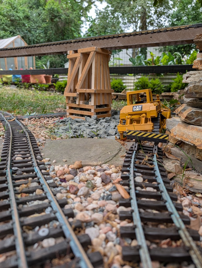 The above structure is called a cribbed trestle because the bottom portion of the structure is known as a crib. It is a box-like assembly that is backfilled with scale boulders. The WESL crew used black basalt chips for boulders. Then, three trestle “bents” were built atop the crib. These are the 5 post vertical uprights that are tightly grouped at the top and fanned out at the bottom. The bents are then connected laterally to each other and then cross-braced. The entire structure was made from cedar for outdoor longevity.